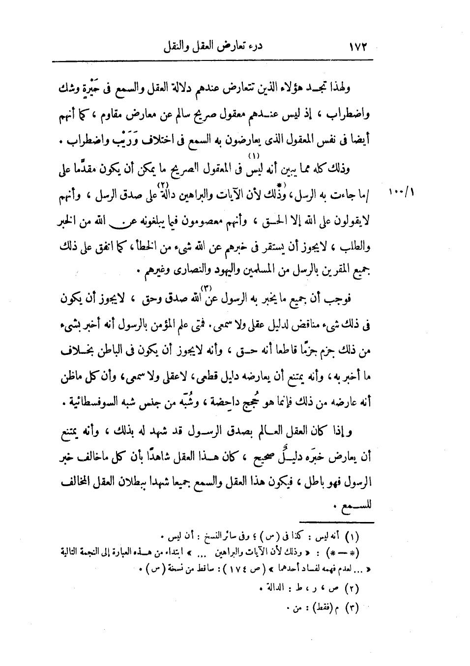 وذلك كله مما يبين أنه ليس في المعقول الصريح ما يمكن أن يكون مقدماً علي ما جاءت به الرسل، وذلك لأن الآيات والبراهين دالة علي صدق الرسل، وأنهم لا يقولون علي الله إلا الحق، وأنهم معصومون فيما يبلغونه عن الله من الخبر والطلب، لا يجوز أن يستقر في خبرهم عن الله شيء من الخطأ، كما اتفق علي ذلك جميع المقرين بالرسل من المسلمين واليهود والنصارى وغيرهم.