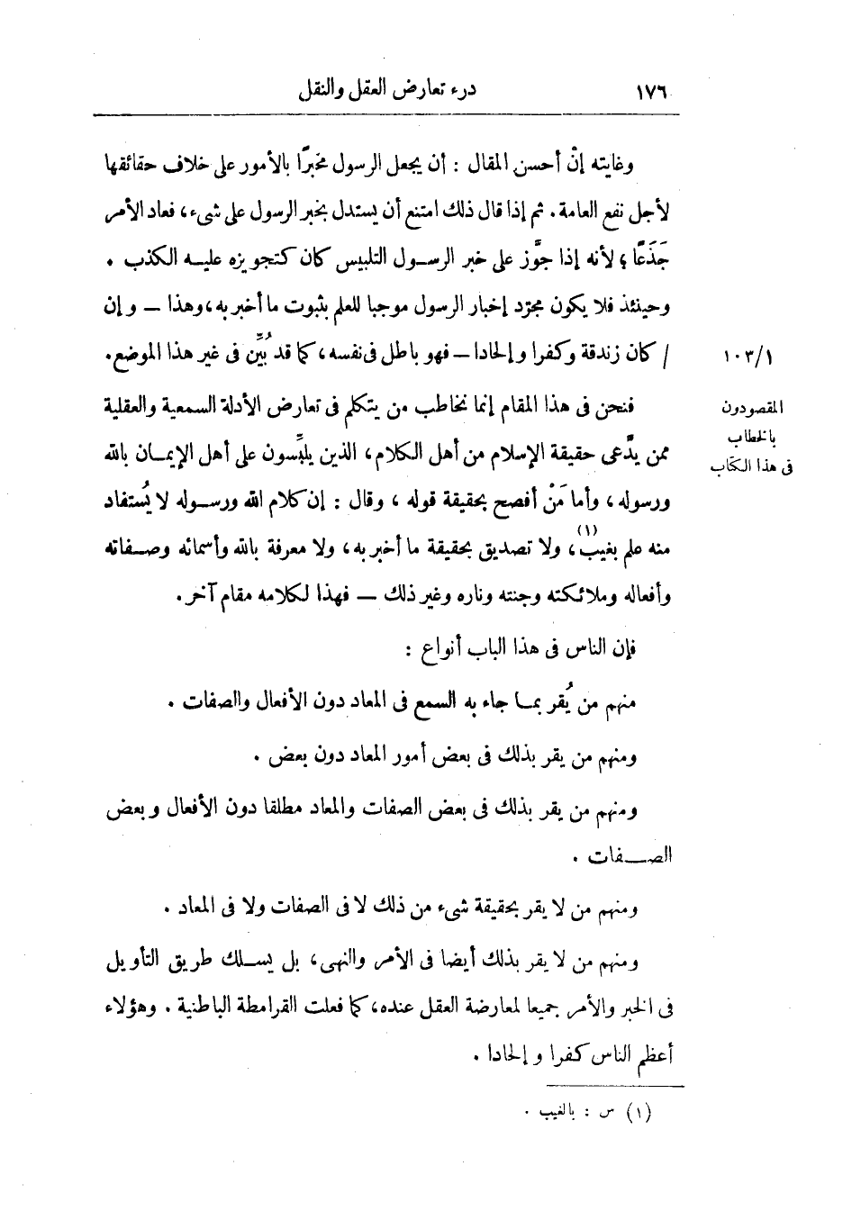 فنحن في هذا المقام إنما نخاطب من يتكلم في تعارض الأدلة السمعية والعقلية ممن يدعي حقيقة الإسلام من أهل الكلام، الذين يلبسون علي أهل الإيمان بالله ورسوله، وأما من أفصح بحقيقة قوله: وقال: إن كلام الله ورسوله لا يستفاد منه علم بغيب، ولا تصديق بحقيقة ما أخبر به، ولا معرفة بالله وأسمائه وصفاته وأفعاله وملائكته وجنته وناره وغير ذلك ـ فهذا لكلامه مقام آخر.