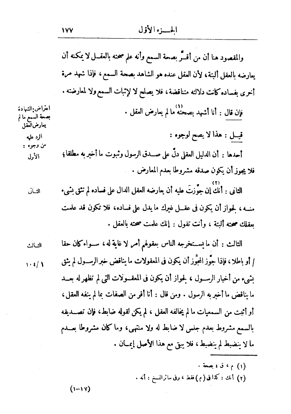 ومن قال: أنا أقر من الصفات بما لم ينفه العقل، أو أثبت من السمعيات ما لم يخالفه العقل، لم يكن لقوله ضابط، فإن تصديقه بالسمع مشروط بعدم جنس لا ضابط له ولا منتهى، وما كان مشروطا بعدم ما لا ينضبط لم ينضبط، فلا يبقي مع هذا الأصل إيمان.