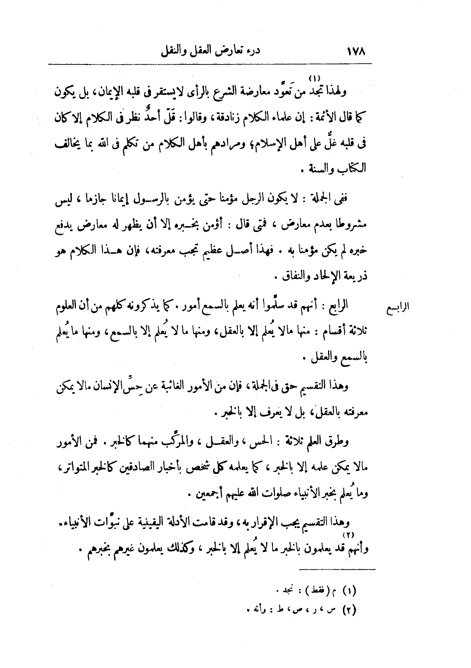 ففي الجملة: لا يكون الرجل مؤمنا حتى يؤمن بالرسول إيماناً جازما، ليس مشروطاً بعدم معارض، فمتي قال: أؤمن بخبره إلا أن يظهر له معارض يدفع خبره لم يكن مؤمناً به، فهذا أصل عظيم تجب معرفته، فإن هذا الكلام هو ذريعة الإلحاد والنفاق.