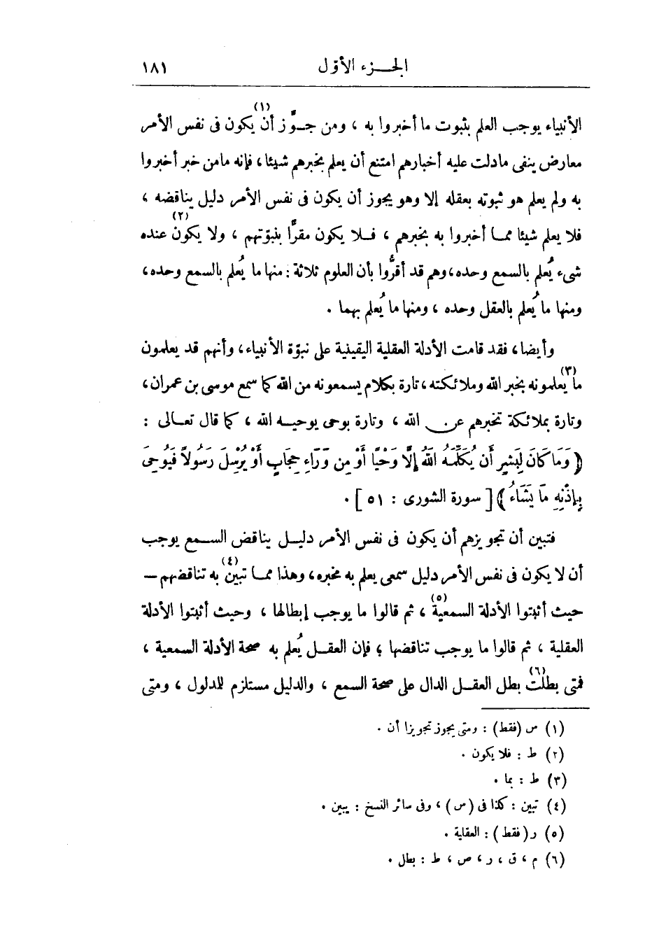 وأيضاً، فقد قامت الأدلة العقلية اليقينية علي نبوة الأنبياء، وأنهم قد يعلمون ما يعلمونه بخبر الله وملائكته، تارة بكلام يسمعونه من الله كما سمع موسى بن عمران، وتارة بملائكة تخبرهم عن الله، وتارة بوحي يوحيه الله، كما قال تعالي {وما كان لبشر أن يكلمه الله إلا وحياً أو من وراء حجاب أو يرسل رسولاً فيوحي بإذنه ما يشاء} [الشورى: 51] .
