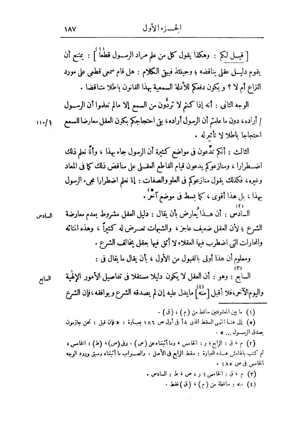 السادس: أن هذا يعارض بأن يقال: دليل العقل مشروط بعدم معارضة الشرع، لأن العقل ضعيف عاجز، والشبهات تعرض له كثيراً، وهذه المتائه والمحارات التي اضطرب فيها العقلاء لا أثق فيها بعقل يخالف الشرع.