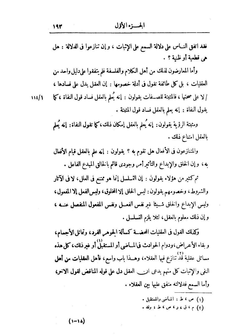 وأما المعارضون لذلك من أهل الكلام والفلسفة فلم يتفقوا علي دليل واحد من العقليات، بل كل طائفة تقول في أدلة خصومها: إن العقل يدل علي فسادها، لا علي صحتها، فالمثبتة للصفات يقولون: إنه يعلم بالعقل فساد قول النفاة، كما يقول النفاة: إنه يعلم بالعقل فساد قول المثبتة.