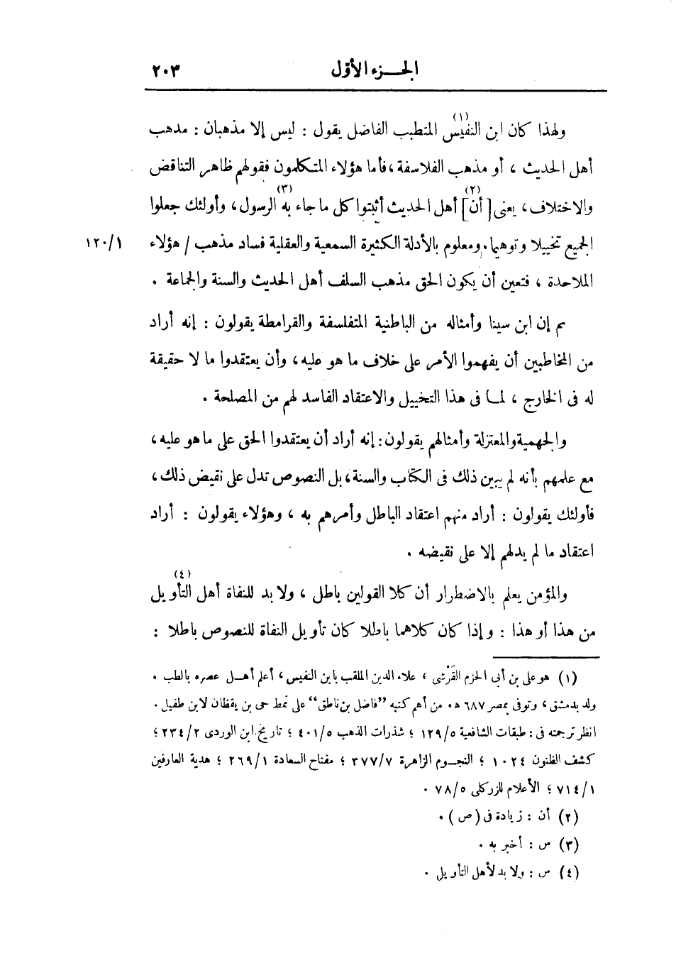 ولهذا كان أبن النفيس المتطبب الفاضل يقول: ليس إلا مذهبان: مذهب أهل الحديث، أو مذهب الفلاسفة، فأما هؤلاء المتكلمون فقولهم ظاهر التناقض والاختلاف، يعين أن أهل الحديث أثبتوا كل ما جاء به الرسل، وأولئك جعلوا الجميع تخيلا وتوهيماً.