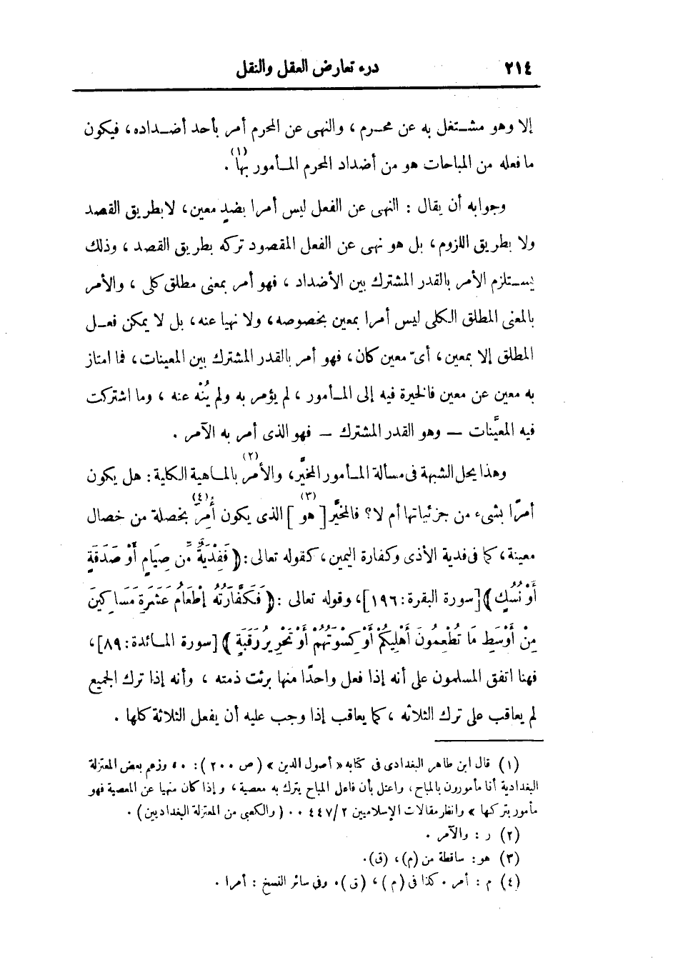 وهذا يحل الشبهة في مسألة المأمور المخير، والأمر بالماهية الكلية: هل يكون أمراً بشيء من جزئياتها أم لا؟ فالمخير هو الذي يكون أمر بخصلة من خصال معينة، كما في فدية الأذى وكفارة اليمين، كقوله تعالى {ففدية من صيام أو صدقة أو نسك} [البقرة: 196] ، وقوله تعالى {فكفارته إطعام عشرة مساكين من أوسط ما تطعمون أهليكم أو كسوتهم أو تحرير رقبة} [المائدة: 89] فهنا اتفق المسلمون علي أنه إذا فعل واحد منها برئت ذمته، وأنه إذا ترك الجميع لم يعاقب علي ترك الثلاثة، كما يعاقب إذا وجب عليه أن يفعل الثلاثة كلها.