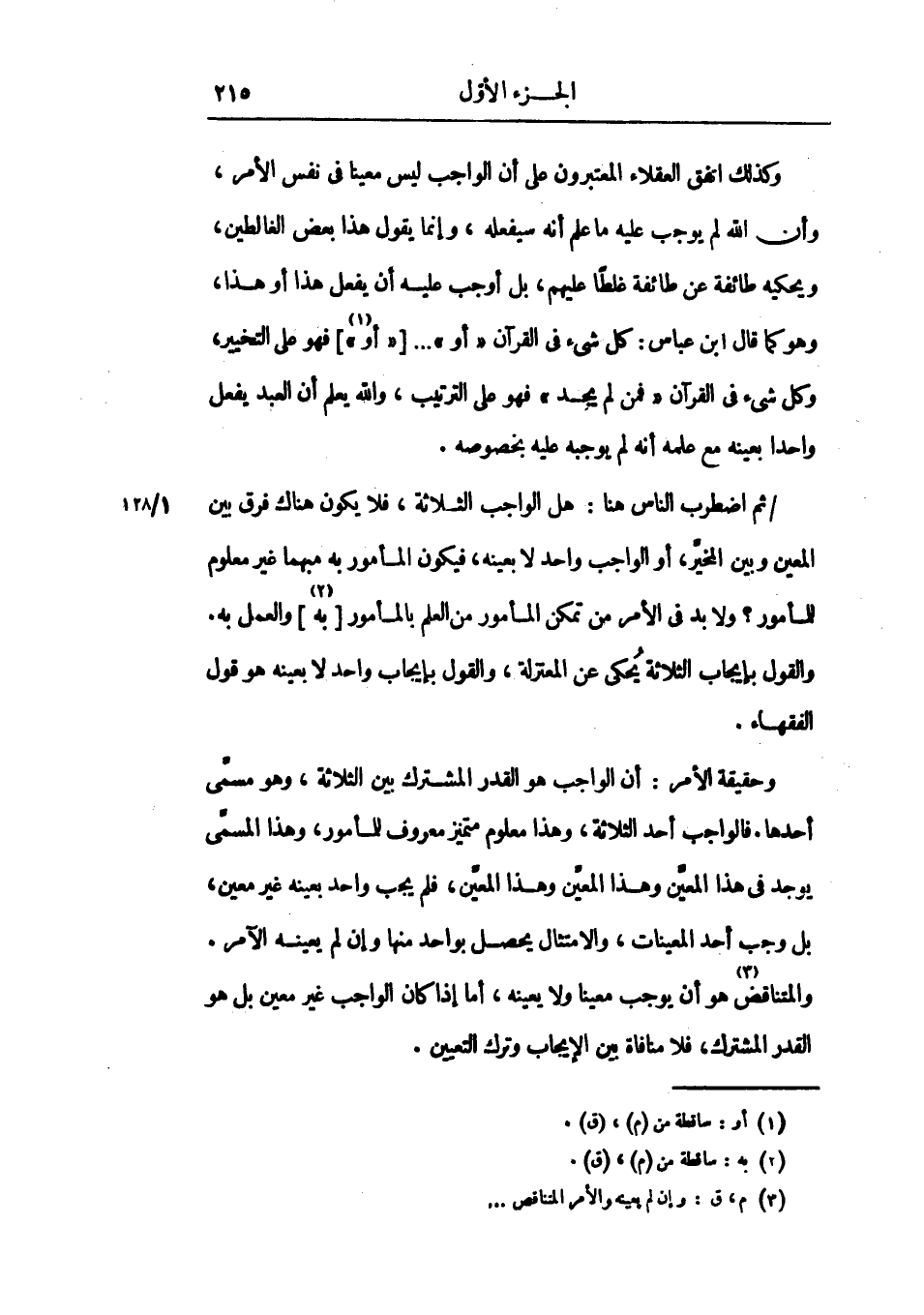 ثم اضطراب الناس هنا: هل الواجب الثلاثة، فلا يكون هناك فرق بين المعين وبين المخير، أو الواجب واحد لا بعينه، فيكون المأمور به مبهماً غير معلوم للمأمور؟ ولا بد في الأمر من تمكن المأمور من العلم بالمأمور به والعمل به، والقول بأيجاب الثلاثة يحكي عن المعنزلة، والقول بإيجاب واحد لا بعينه هو قول الفقهاء.