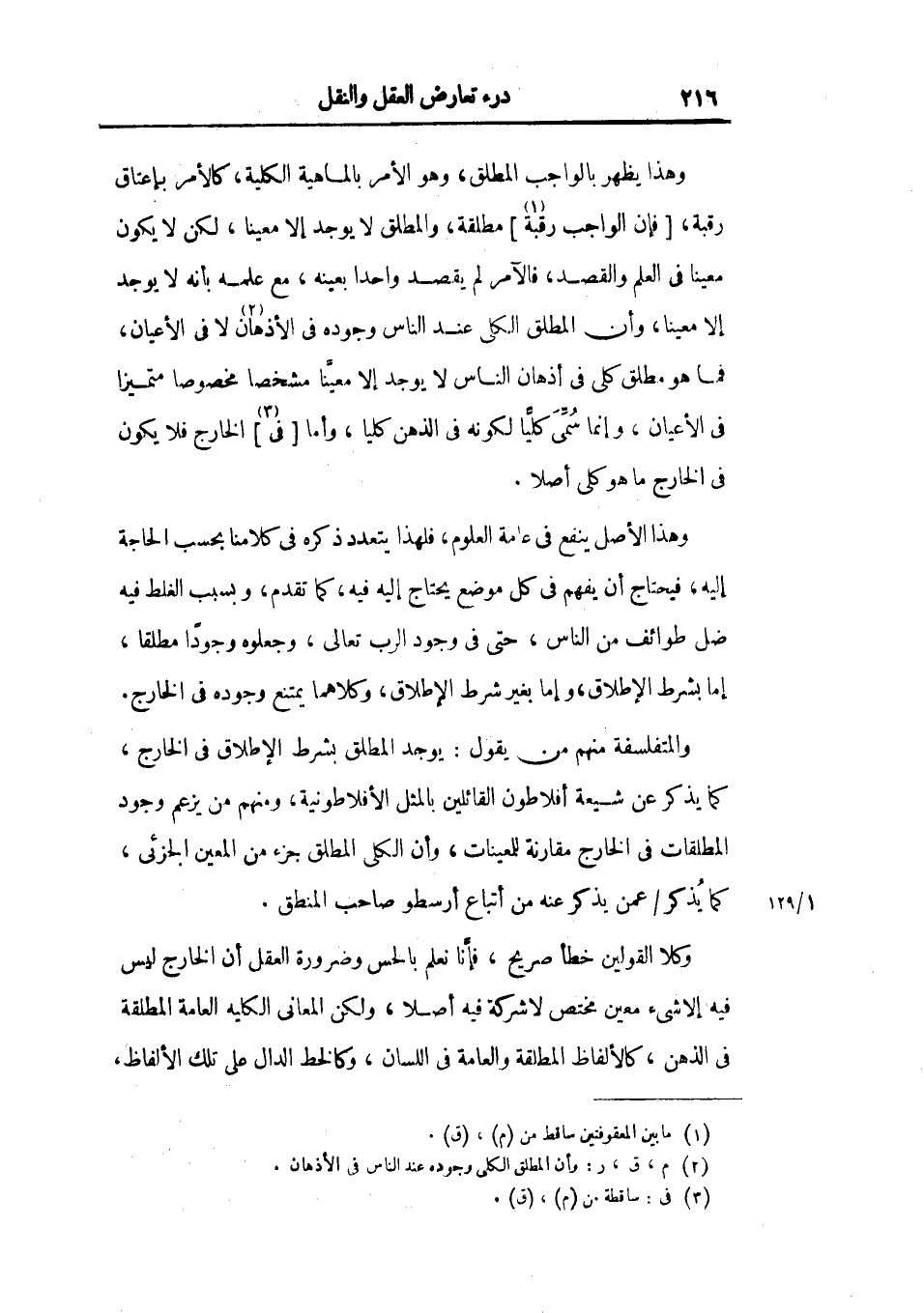 وهذا الأصل ينفع في عامة العلوم، فلهذا يتعدد ذكره في كلامنا بحسب الحاجة إليه، فيحتاج أن يفهم في كل موضع يحتاج إليه فيه، كما تقدم، وبسبب الغلط فيه ضل طوائف من الناس، حتى في وجود الرب تعالي، وجعلوه وجوداً مطلقاً، إما بشرط الإطلاق، وإما بغير شرط الإطلاق، وكلاهما يمتنع وجوده في الخارج.