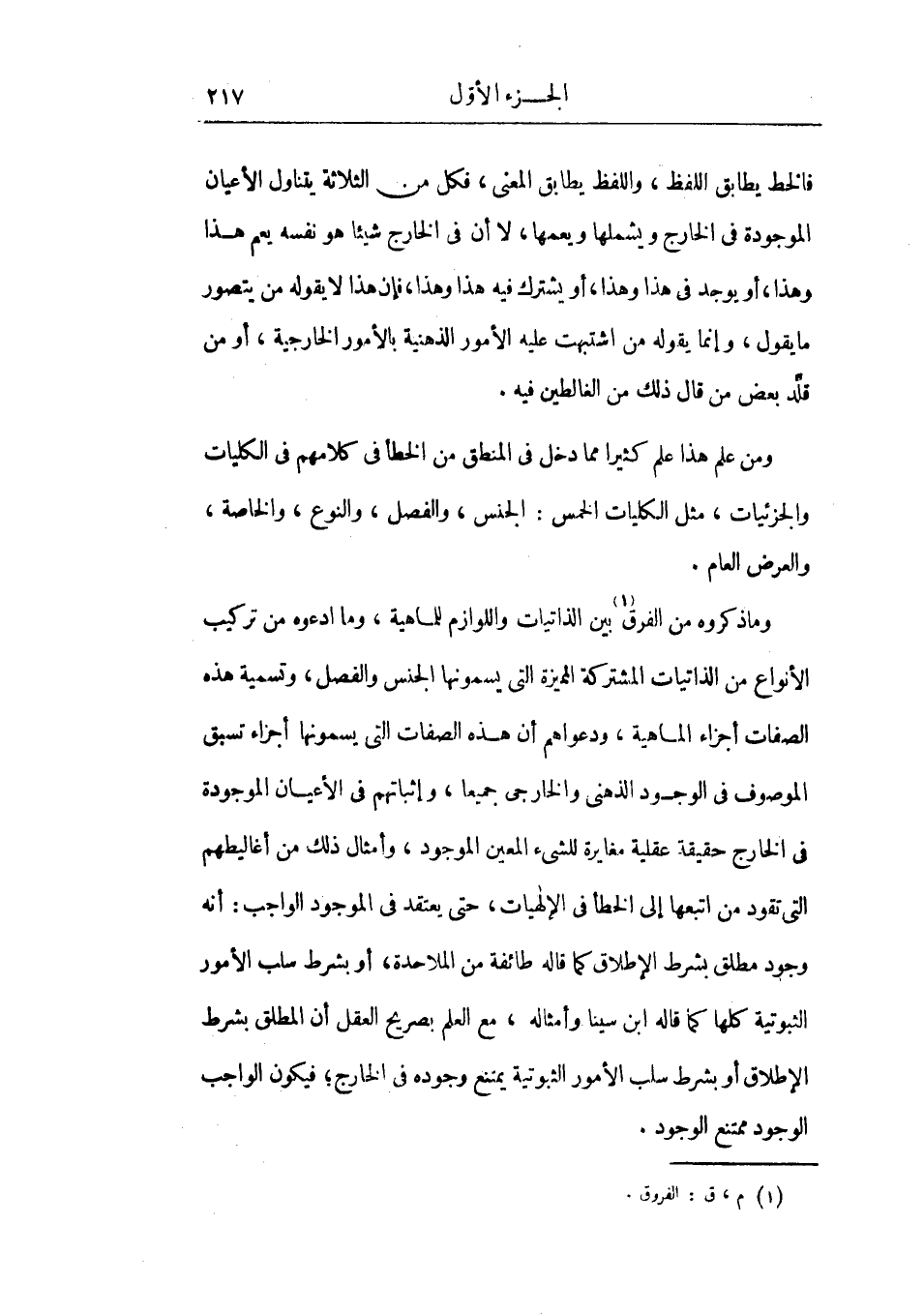 وما ذكروه من الفرق بين الذاتيات واللوازم للماهية، وما ادعوه من تركيب الأنواع من الذاتيات المشتركة المميزة التي يسمونها الجنس والفصل، وتسمية هذه الصفات أجزاء الماهية، ودعواهم أن هذه الصفات التي يسمونها أجزاء تسبق الموصوف في الوجود الذهني والخارجي جميعاً، وإثباتهم في الأعيان الموجودة في الخارج حقيقة عقلية مغايرة للشيء المعين الموجود، وأمثال ذلك من أغاليطهم التي تقود من اتبعها إلي الخطأ في الإلهيات، حتى يعتقد في الموجود الواجب: أنه وجود مطلق بشرط الإطلاق كما قاله طائفة من الملاحدة، أو بشرط سلب الأمور الثبوتية كلها كما قاله ابن سينا وأمثاله، مع العلم بصريح العقل أن المطلق بشرط الإطلاق أو بشرط سلب الأمور الثبوتية يمتنع وجوده في الخارج، فيكون الواجب الوجود ممتنع الوجود.