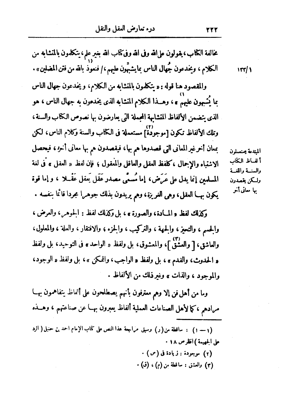 والمقصود هنا قوله: يتكلمون بالمتشابه من الكلام، ويخدعون جهال الناس بما يشبهون عليهم، وهذا الكلام المتشابه الذي يخدعون به جهال الناس، هو الذي يتضمن الألفاظ المتشايهة المجملة التي يعارضون بها نصوص الكتاب والسنة، وتلك الألفاظ تكون موجودة مستعملة في الكتاب والسنة وكلام الناس، لكن بمعان أخر غير المعاني التي قصدوها هم بها، فيقصدون هم بها معاني أخر، فيحصل الاشتباه والإجمال، كلفظ العقل والعاقل والمعقول، فإن لفظ العقل في لغة المسلمين إنما يدل علي عرض، إما مسمي مصدر عقل يعقل عقلا، وإما قوة يكون بها العقل، وهي العزيزة، وهم يريدون بذلك جوهراً مجرداً قائماً بنفسه.