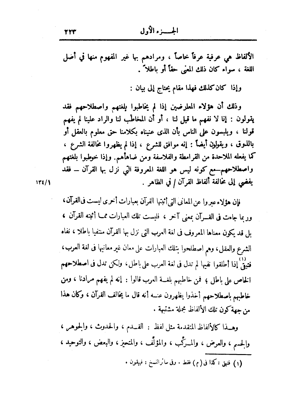 فإن هؤلاء عبروا عن المعاني التي أثبتها القرآن بعبارات أخري ليست في القرآن، وربما جاءت في القرآن بمعني آخر، فليست تلك العبارات مما أثبته القرآن، بل قد يكون معناها المعروف في لغة العرب التي نزل بها القرآن منتفياً باطلاً، نفاه الشرع والعقل، وهم اصطلحوا بتلك العبارات علي معان غير معانيها في لغة العرب، فتبقي إذا أطلقوا نفيها لم تدل في لغة العرب علي باطل، ولكن تدل في اصطلاحهم الخاص علي باطل، فمن خاطبهم بلغة العرب قالوا: إنه لم يفهم مرادنا، ومن خاطبهم باصطلاحهم أخذوا يظهرون عنه أنه قال ما يخالف القرآن، وكان هذا من جهة كون تلك الألفاظ مجملة مشتبهة.