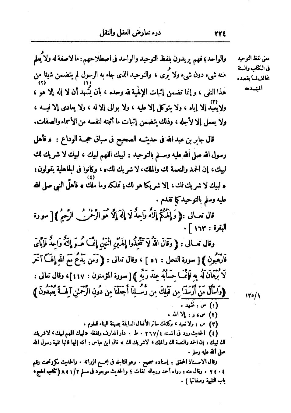 قال جابر بن عبد الله في حديثه الصحيح في سياق حجة الوداع «فأهل رسول الله صلى الله عليه وسلم بالتوحيد: لبيك اللهم لبيك، لبيك لا شريك لك لبيك، إن الحمد والنعمة لك والملك، لا شريك لك» وكانوا في الجاهلية يقولولن: لبيك لا شريك لك، إلا شريكا هو لك، تملكه وما ملك فأهل النبي صلي الله عليه وسلم بالتوحيد كما تقدم.