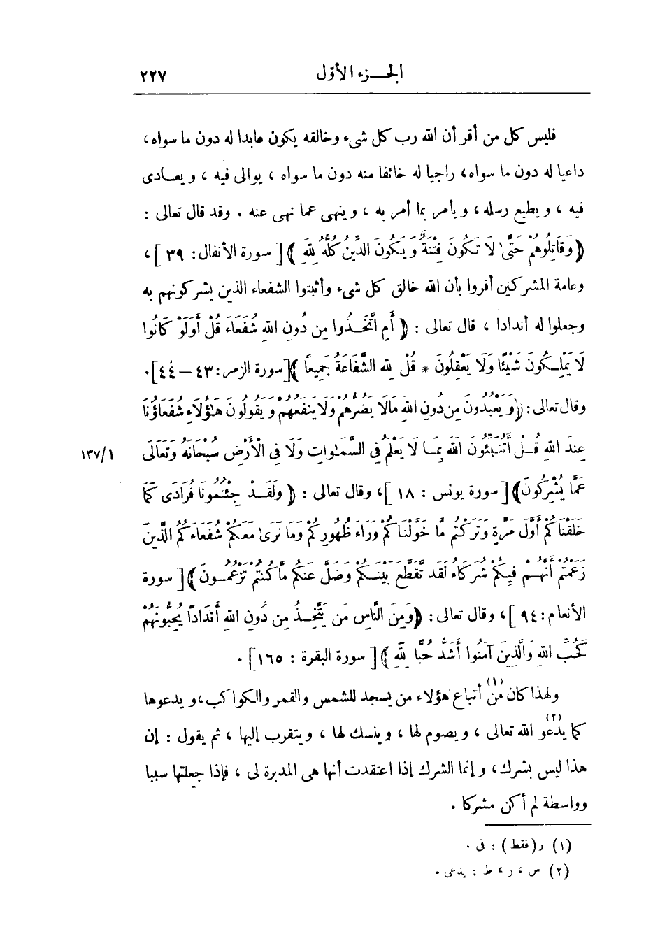 ولهذا كان من أتباع هؤلاء من يسجد للشمس والقمر والكواكب، ويدعوها كما يدعو الله تعالي، ويصوم لها، وينسك لها، ويتقرب إليها، ثم يقول: إن هذا ليس بشرك: وإنما الشرك إذا اعتقدت أنها هي المدبرة لي، فإذا جعلتها سبباً وواسطة لم أكن مشركاً.