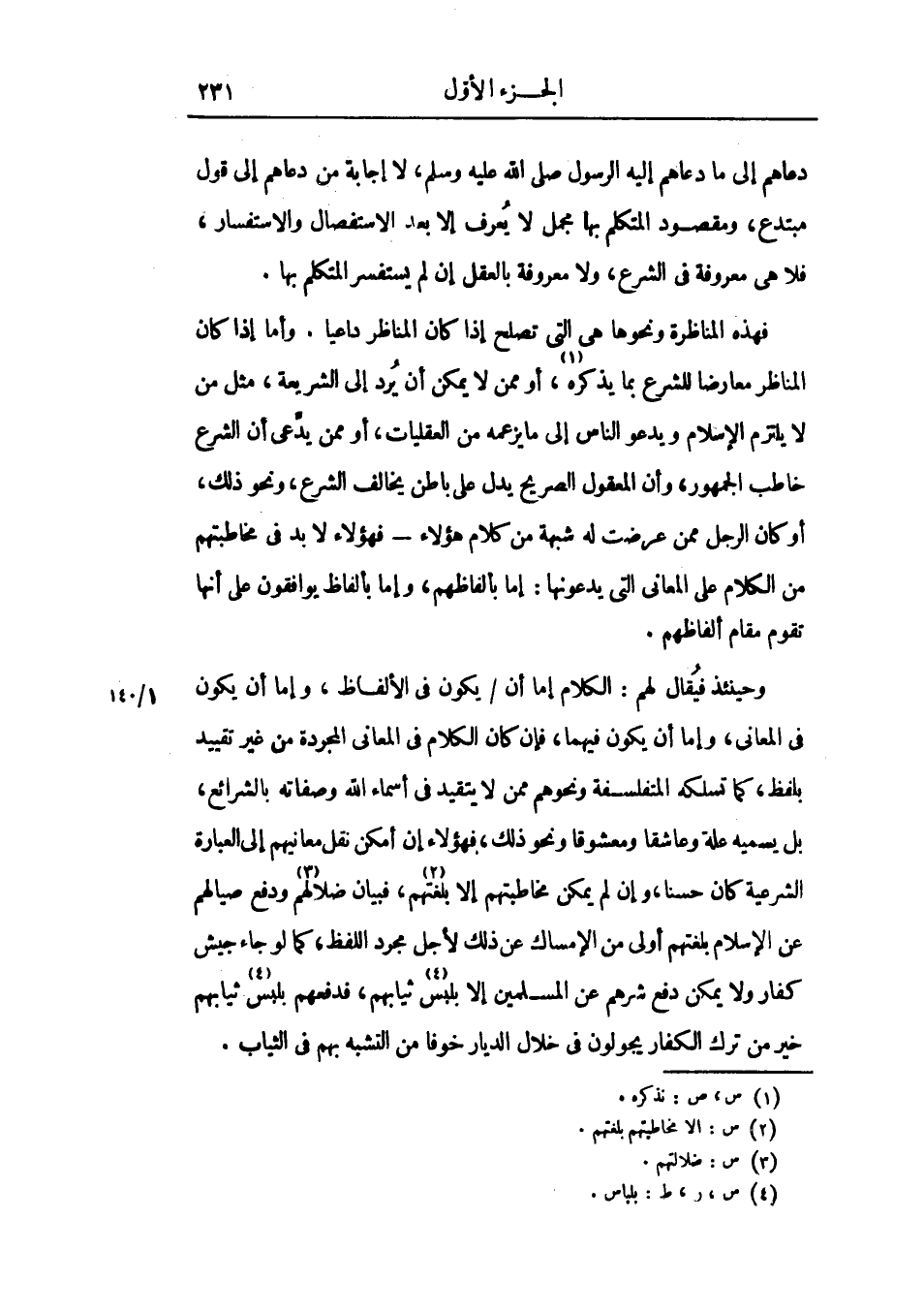 وحينئذ فيقال لهم: الكلام إما أن يكون في الألفاظ، وإما أن يكون في المعاني، وإما أن يكون فيهما، فإن كان الكلام في المعاني المجردة من غير تقييد بلفظ، كما تسلكه المتفلسفة ونحوهم ممن لا يتقيد في أسماء الله وصفاته بالشرائع، بل يسميه علة وعاشقاً ومعشوقاً ونحو ذلك، فهؤلاء إن أمكن نقل معانيهم إلي العبارة الشرعية كان حسناً، وإن لم يمكن مخاطبتهم إلا بلغتهم، فبيان ضلالهم ودفع صيالهم عن الإسلام بلغتهم أولي من الإمساك عن ذلك لأجل مجرد اللفظ، كما لو جاء جيش كفار ولا يمكن دفع شرهم عن المسلمين إلا بلبس ثيابهم، فدفعهم بلبس ثيابهم خير من ترك الكفار يجولون في خلال الديار خوفاً من التشبه بهم في الثياب.
