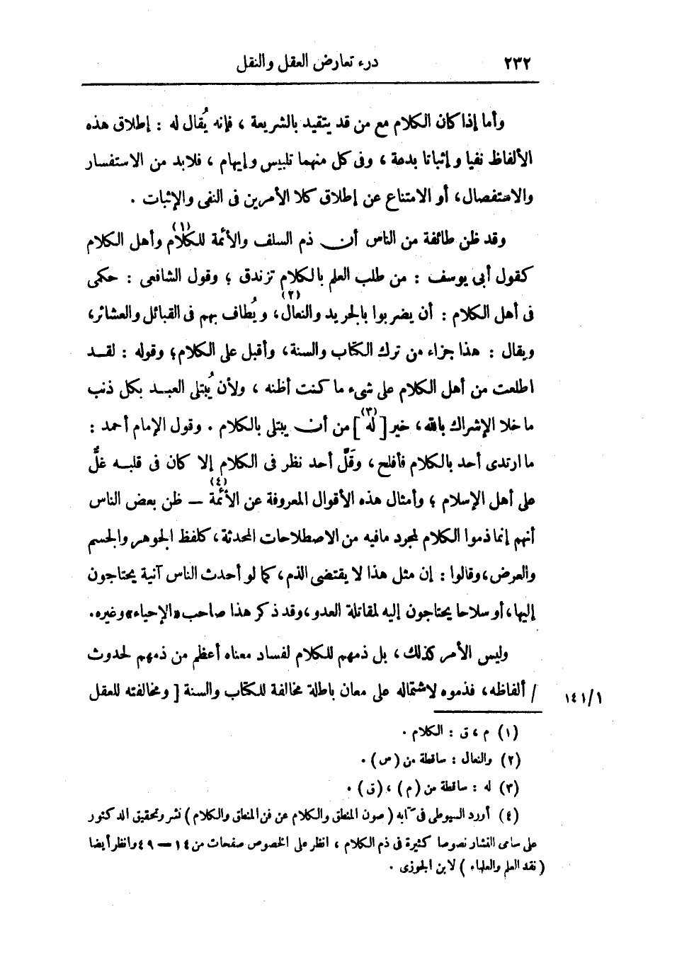 وقد ظن طائفة من الناس ان ذم السلف والأئمة للكلام وأهل الكلام كقول أبي يوسف: من طلب العلم بالكلام تزندق، وقول الشافعي: حكمي في أهل الكلام: أن يضربوا بالجريد والنعال، ويطاف بهم في القبائل والعشائر، ويقال: هذا جزاء من ترك الكتاب والسنة، وأقبل علي الكلام، وقوله: لقد اطلعت من أهل الكلام علي شيء ما كنت أظنه، ولأن يبتلي العبد بكل ذنب ما خلا الإشراك بالله، خير له نظر في الكلام إلا كان في قلبه غل علي أهل الإسلام، وأمثال هذه الأقوال المعروفة عن الأئمة ـ ظن بعض الناس أنهم إنما ذموا الكلام لمجرد ما فيه من الاصطلاحات المحدثة، كلفظ الجوهر والسجم والعرض، وقالوا: إن مثل هذا لا يقتضي الذم، كما لو أحدث الناس آنية يحتاجون إليها، أو سلاحاً يحتاجون إليه لمقاتلة العدو، وقد ذكر هذا صاحبالإحياء وغيره.