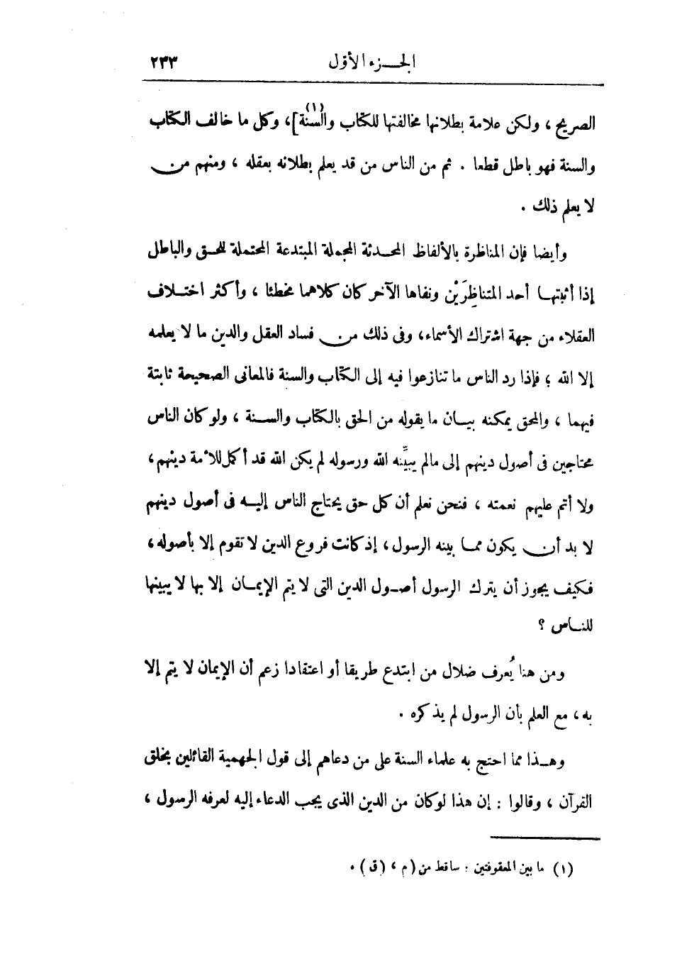 وأيضاً فإن المناظرة بالألفاظ المحدثة المجملة المبتدعة المحتملة للحق والباطل إذا أثبتها أحد المتناظرين ونفاها الآخر كان كلاهما مخظئاً، وأكثر اختلاف العقلاء من جهة اشتراك الأسماء، وفي ذلك من فساد العقل والدين ما لا يعلمه إلا الله، فإذا رد الناس ما تنازعوا فيه إلى الكتاب والسنة فالمعاني الصحيحة ثابتة فيهما، والمحق يمكنه بيان ما يقوله من الحق بالكتاب والسنة، ولو كان الناس محتاجين في أصول دينهم إلي ما لم يبينه الله ورسوله لم يكن الله قد أكمل للأمة دينهم، ولا أتم عليهم نعمته، فنحن نعلم أن كل حق يحتاج الناس إليه في أصول دينهم لا بد أن يكون مما بينه الرسول، إذ كانت فروع الدين لا تقوم إلا بأصوله، فكيف يجوز أن يترك الرسول أصول الدين التي لا يتم الإيمان إلا بها لا يبينها للناس؟