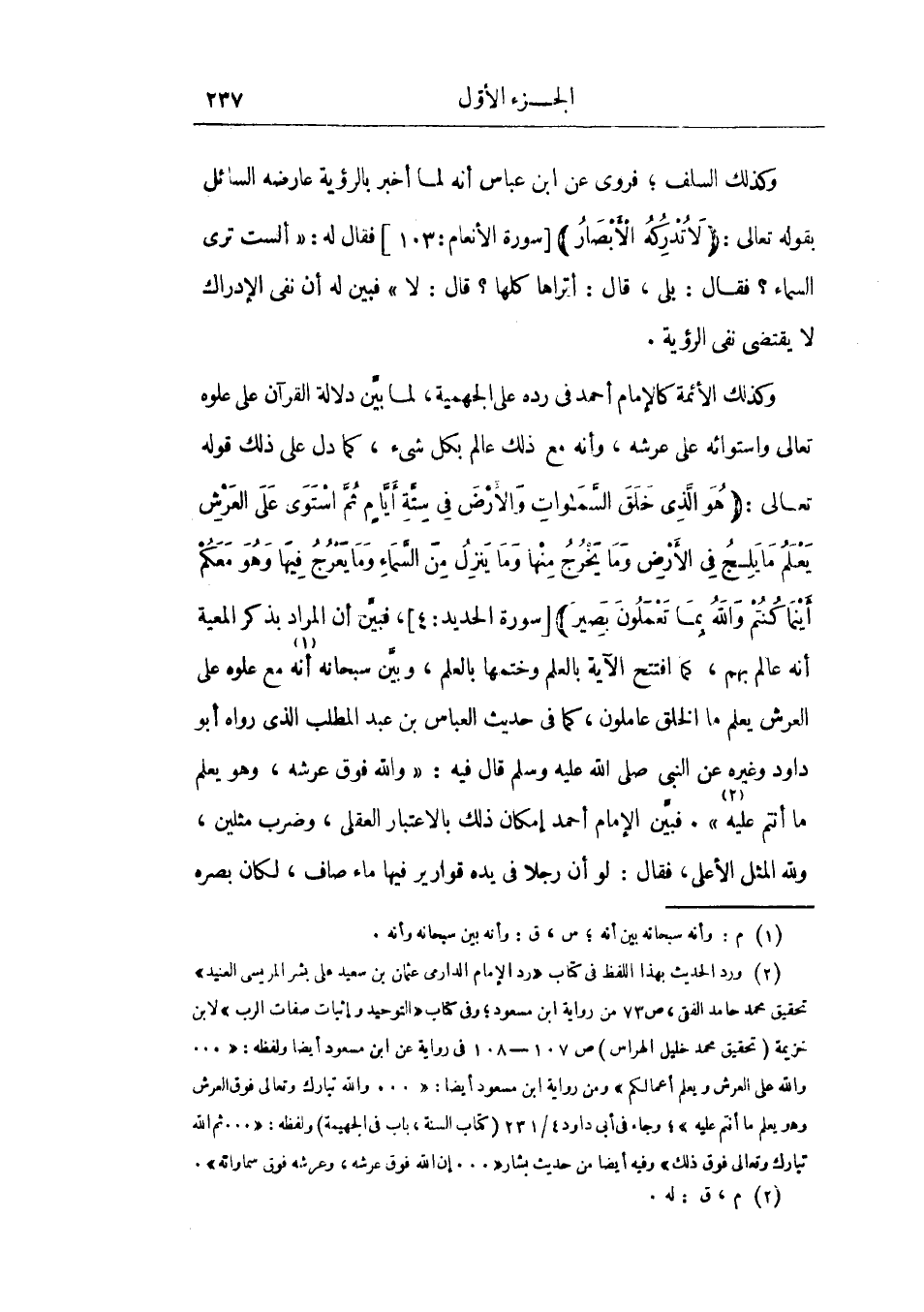 وكذلك الأئمة كالإمام أحمد في رده على الجهمية، لما بين دلالة القرآن على علوه تعالي واستوائه على عرشه، وأنه مع ذلك عالم بكل شيء، كما دل على ذلك قوله تعالى: {هو الذي خلق السماوات والأرض في ستة أيام ثم استوى على العرش يعلم ما يلج في الأرض وما يخرج منها وما ينزل من السماء وما يعرج فيها وهو معكم أين ما كنتم والله بما تعملون بصير} [الحديد: 4] ، فبين أن المراد بذكر المعية أنه عالم بهم، كما افتتح الآية بالعلم وختماها العلم، وبين سبحانه أنه مع علوه على العرش يعلم ما الخلق عاملون، كما في حديث العباس بن عبد المطلب الذي رواه داود وغيره عن النبي صلي الله عليه وسلم قال فيه «والله فوق عرشه، وهو يعلم ما أنتم عليه» فبين الإمام أحمد إمكان ذلك بالاعتابر العقلي، وضرب مثلين، ولله المثل الأعلى، فقال: لو أن رجلاً في يده قوارير فيها ماء صاف، لكان بصره