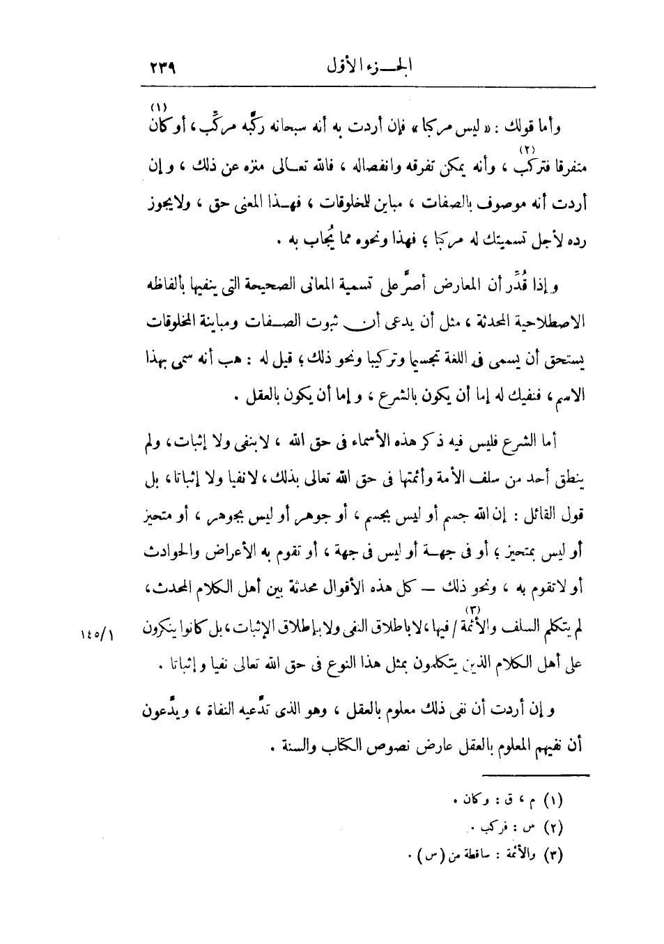 وأما قولك: ليس مركباً فإن أردت به أنه سبحانه ركبه مركب، أو كان متفرقاً فتركب، وأنه يمكن تفرقه وانفصاله، فالله تعالى منزه عن ذلك، وإن أردت أنه موصوف بالصفات، مباين للمخلوقات، فهذا المعني حق، ولا يجوز رده لأجل تسميتك له مركبا، فهذا ونحوه مما يجاب به.