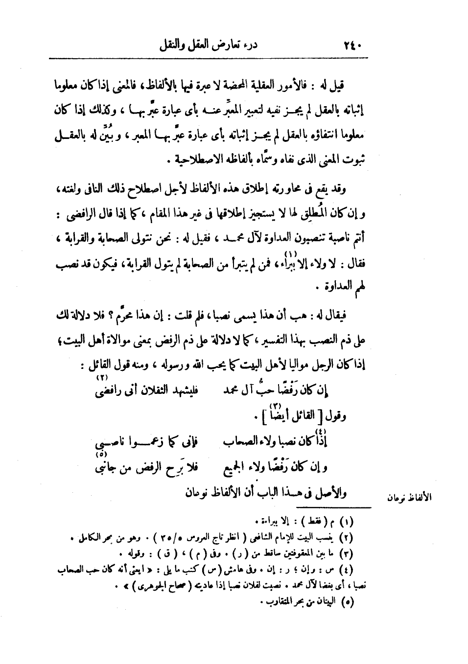 وقد يقع في محاورته إطلاق هذه الألفاظ لأجل اصطلاح ذلك النافي ولغته، وإن كان المطلق لها لا يستجيز إطلاقها في غير هذا المقام، كما إذا قال الرافضي: أنتم ناصبة تنصبون العداوة لآل محمد، فقيل له: نحن نتولى الصحابة والقرابة، فقال: لا ولاء إلا ببراء، فمن لم يتبرأ من الصحابة لم يتول القرابة، فيكون قد نصب لهم العداوة.