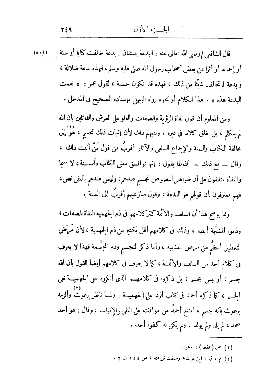 ومن المعلوم أن قو ل نفاة الرؤية والصفات والعلو على العرش والقائلين بأن الله لم يتلكم، بل خلق كلاماً في غيره، ونفيهم ذلك لأن إثبات ذلك تجسيم، هو إلي مخالفة الكتاب والسنة والإجماع السلفي والآثار أقرب من قول من أثبت ذلك، وقال ـ مع ذلك ـ ألفاظاً يقول: إنها توافق معنى الكتاب والسنة، لا سيما والنفاة متفقون على أن ظواهر النصوص تجسيم عندهم، وليس عندهم بالنفي نص، فهم معترفون بأن قولهم هو البدعة، وقول منازعهم أقرب إلى السنة.
