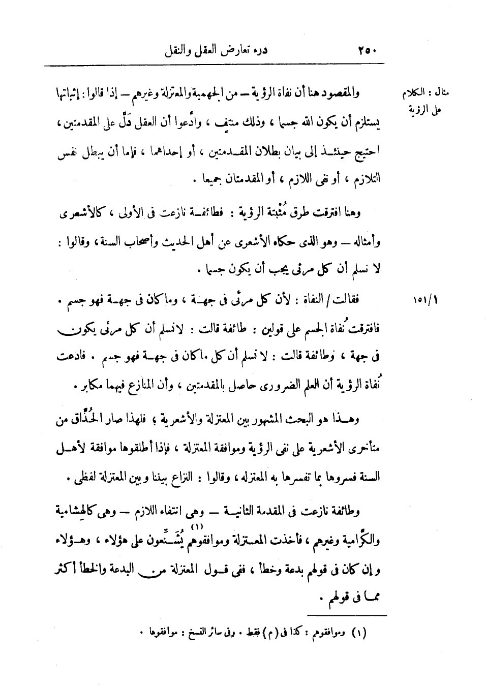 وهذا هو البحث المشهور بين المعتزلة والأشعرية، فلهذا صار الحذاق من متأخري الأشعرية على نفي الرؤية وموافقة المعتزلة، فإذا أطلقوها موافقة لأهل السنة فسروها بما تفسرها به المعتزلة، وقالوا: المزاع بيننا وبين المعتزلة لفظي.