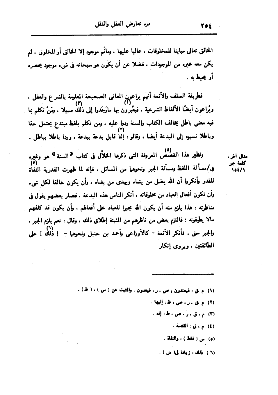ونظير هذا القصص المعروفة التي ذكرها الخلال في كتاب السنة هو وغيره في مسألة اللفظ ومسألة الجبر ونحوهما من المسائل، فإنه لما ظهرت القدرية النفاة للقدر وأنكروا أن الله يضل من يشاء ويهدي من يشاء، وأن يكون خالقاً لكل شيء وأن تكون أفعال العباد من مخلوقاته، أنكر الناس هذه البدعة، فصار بعضهم يقول في مناظرته: هذا يلزم منه أن يكون الله مجبراً للعباد على أفعالهم، وأن يكون قد كلفهم ما لا يطيقونه، فالتزم بعض من ناظرهم من المثبتة إطلاق ذلك، وقال: نعم يلزم الجبر، والجبر حق، فأنكر الأئمة ـ كـ الأوزاعي وأحمد بن حنبل ونحوهما ـ ذلك على الطائفتين، ويروى إنكار