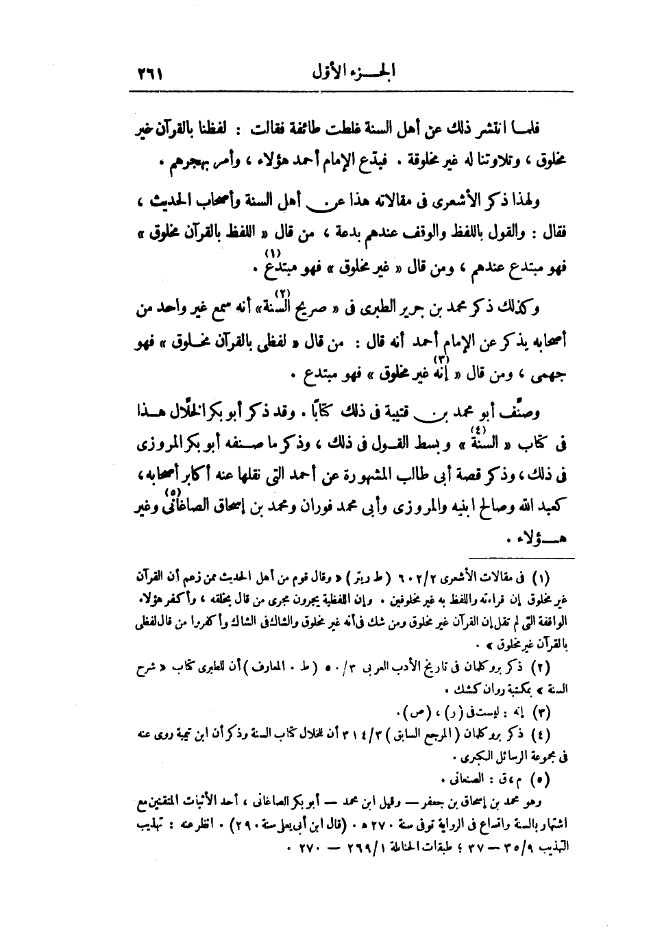 وصنف أبو أحمد بن قتيبة في ذلك كتاباً، وقد ذكر أبو بكر الخلال هذا في كتاب السنة وبسط القول في ذلك، وذكر ما صنفه أبو بكر المروزي في ذلك، وذكر قصة أبي طالب المشهورة التي نقلها عنه أكابر أصحابه، كعبد الله وصالح ابنيه والمروزي وأبي محمد فوران ومحمد بن إسحاق الصاغني وغير هؤلاء.