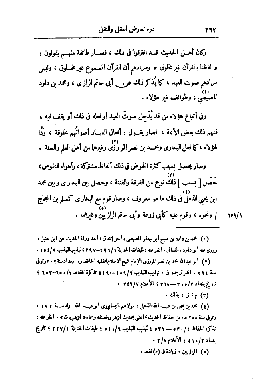 وكان أهل الحديث قد أفتوقوا في ذلك، فصار طائفة منهم يقولون: لفظنا بالقرآن غير مخلوق ومرادهم أن القرآن المسموع غير مخلوق، وليس مراده صوت العبد، كما يذكر ذلك عن أبي حاتم الرازي، ومحمد بن داود المصيصي، وطوائف غير هؤلاء.
