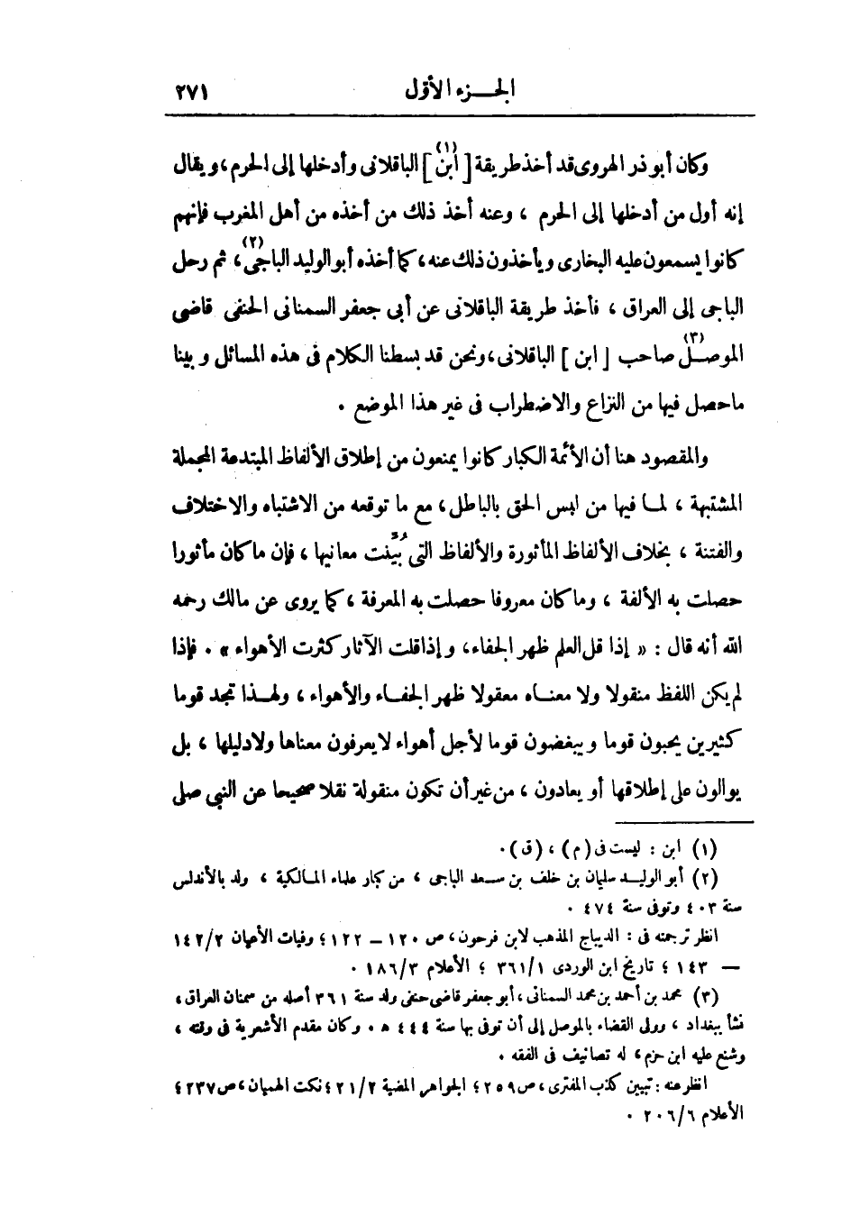 وكان أبو ذر الهروي قد أخذ طريقة ابن الباقلاني وأدخلها إلى الحرم، ويقال إنه أول من أدخلها إلى الحرم، وعنه أخذ ذلك من أخذه من أهل المغرب فإنهم كانوا يسمعون عليه البخاري ويأخذون ذلك عنه، كما أخذه أبو الوليد الباجي، ثم رحل الباجي إلى العرق، فأخذ طريقة الباقلاني عن أبي جعفر السمناني قاضي الموصل صاحب ابن الباقلاني، ونحن قد بسطنا الكلام في هذه المسائل وبينا ما حصل فيها من النزاع والاضطراب في غير هذا الموضع.
