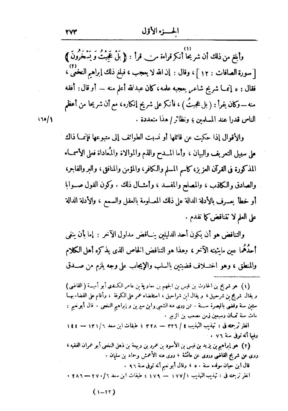 وأبلغ من ذلك أن شريحاً أنكر قراءة من قرأ {بل عجبت ويسخرون} [الصافات: 12] وقال: إن الله لا يعجب، فبلغ ذلك إبراهيم النخعي، فقال: إنما شريح شاعر يعجبه علمه، كان عبد الله أعلم منه أو قال: أفقه منه ـ وكان يقرأ) بل عجبت) فأنكر على شريح إنكاره، مع أن شريحاً من أعظم الناس قدراً عند المسلمين، ونظائر هذا متعددة.