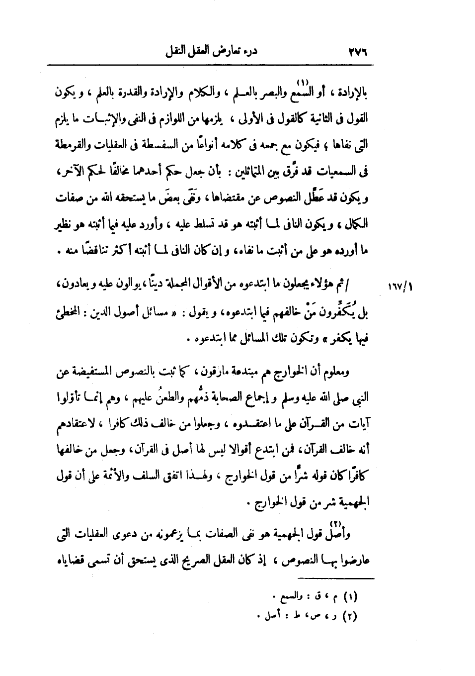 بالإرادة، أو السمع والبصر بالعلم، والكلام والإرادة والقدرة بالعلم، ويكون القول في الثانية كالقول في الأولى، يلزمها من اللوازم في النفي والإثبات ما يلزم التي نفاها، فيكون مع جمعه في كلامه أنواعاً من السفسطة في العقليات والقرمطة في السمعيات قد فرق بين المتماثلين: بأن جعل حكم أحدهما مخالفاً لحكم الآخر، ويكون قد عطل النصوص عن مقتضاها، ونفى بعض ما يستحق الله من صفات الكمال، ويكون النافي لما أثبته هو قد تسلط عليه، وأورد عليه فيما أثبته هو نظير ما أورده هو على من أثبت ما نفاه، وإن كان النافي لما أثبته أكثر تناقضاً منه.