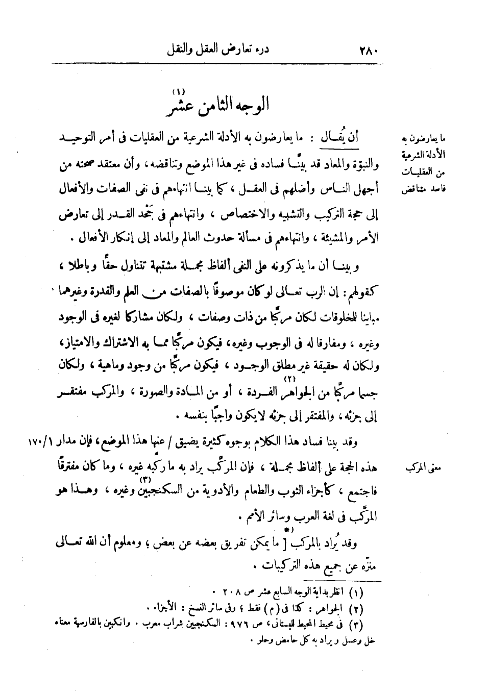 وقد بينا فساد هذا الكلام بوجوه كثيرة يضيق عنها هذا الموضع، فإن مدار هذه الحجة على ألفاظ مجملة، فإن المركب يراد به ما ركبه غيره، وما كان مفترقاً فاجتمع، كأجزاء الثوب والطعام والأدوية من السكنجبين وغيره، وهذا هو المركب في لغة العرب وسائر الأمم.