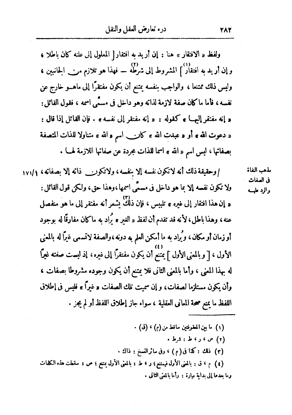 وحقيقة ذلك أنه لا تكون نفسه إلا بنفسه، ولا تكون ذاته إلا بصفاته، ولا تكون نفسه إلا بما هو داخل في مسمى أسمها، وهذا نحق، ولكن قول القائل إن هذا افتقار إلى غيره تلبيس، فإن ذلك يشعر أنه مفتقر إلى ما هو منفصل عنه، وهذا باطل، لأنه قد تقدم أن لفظ الغير يراد به ما كان مفارقاً له بوجود أو زمان أو مكان ويراد يه ما أمكن العلم به دونه والصفة لا تسمى غيرا له بهذا المعنى، وأما بالمعنى الثاني فلا يمتنع أن يكون وجوده مشروطا بصفات، وأن يكون مستلزما لصفات، وإن سميت تلك الصفات غيراً فليس في إطلاق اللفظ ما يمنع صحة المعاني العقلية، سواء جاز إطلاق اللفظ أو لم يجز.