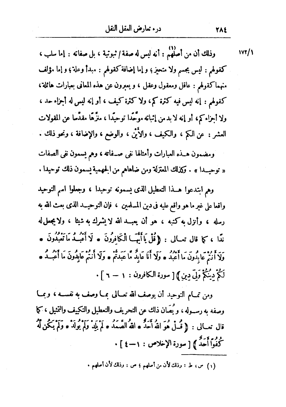 وهم ابتدعوا هذا التعطيل الذي يسمونه توحيداً، وجعلوا اسم التوحيد واقعاً على غير ما هو واقع عليه في دين المسلمين، فإن التوحيد الذي بعث الله له رسله، وأنزل به كتبه، هو أن يعبد الله لا يشرك به شيئاً، ولا يجعل له نداً، كما قال تعالى {قل يا أيها الكافرون * لا أعبد ما تعبدون * ولا أنتم عابدون ما أعبد * ولا أنا عابد ما عبدتم * ولا أنتم عابدون ما أعبد * لكم دينكم ولي دين} [الكافرون: 1-6] .