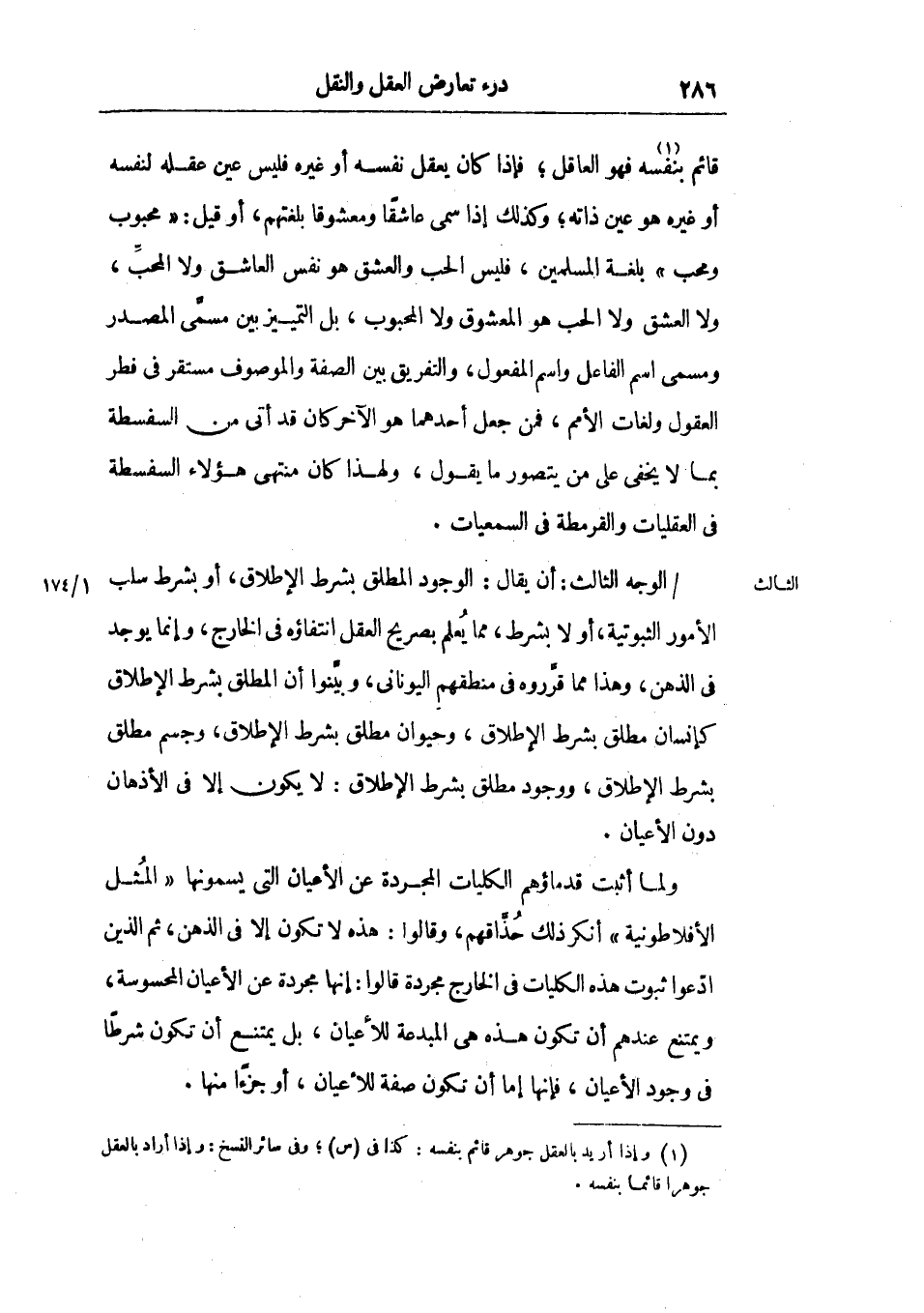 قائم بنفسه فهو العاقل، فإذا كان يعقل نفسه أو غيره فليس عين عقله لنفسه أو غيره هو عين ذاته، وكذلك إذا سمى عاشقاً ومعشوقاً بلغتهم، أو قيل: محبوب ومحب بلغة المسلمين، فليس الحب والعشق هو نفس العاشق ولا المحب، ولا العشق ولا الحب هو المعشوق ولا المحبوب، بل التمييز بين مسمى المصدر ومسمى اسم الفاعل واسم المفعول، والتفريق بين الصفة والموصوف مستقر في فطر العقول ولغات الأمم، فمن جعل أحدهما هو الآخر كان قد أتى من السفسطة بما لا يخفى على من يتصور ما يقول: ولهذا كان منتهى هؤلاء السفسطة في العقليات والقرمطة في السمعيات.