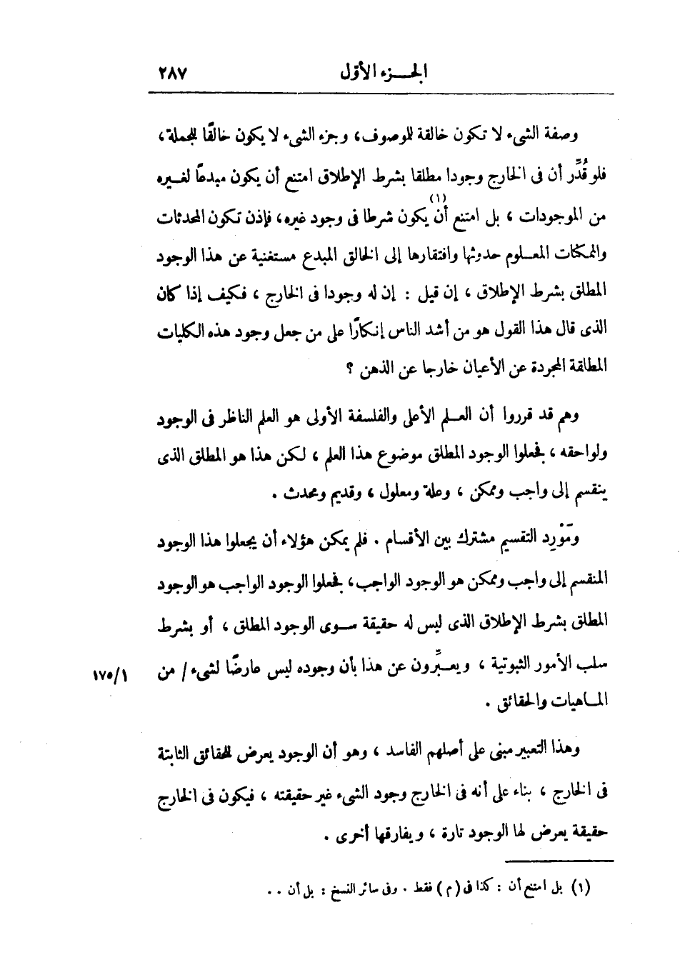 فلم يمكن هؤلاء أن يجعلوا هذا الوجود المنقسم إلى واجب وممكن هو الوجود الواجب، فجعلوا الوجود الواجب هو الوجود المطلق بشرط الإطلاق الذي ليس له حقيقة سوى الوجود المطلق، أو بشرط سلب الأمور الثبةتية، ويعبرون عن هذا بأن وجوده ليس عارضاً لشيء من الماهيات والحقائق.