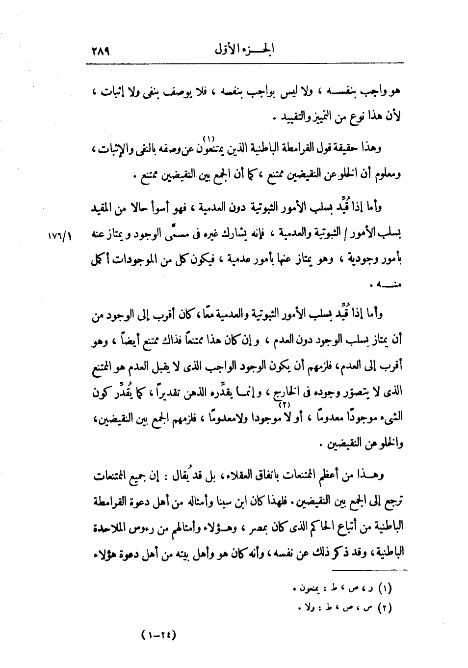 وأما إذا قيد بسلب الأمور الثبوتية والعدمية معا، كان أقرب إلى الوجود من أن يمتاز بسلب الوجود دون العدم، وإن كان هذا ممتنعاً فذاك ممتنع أيضاً، وهو أقرب إلى العدم، فلزمهم أن يكون الوجود الواجب الذي لا يقبل العد هو الممتنع الذي لا يتصور وجوده في الخارج، وإنما يقدره الذهن تقديراً، كما يقدر كون الشيء موجوداً معدوماً، أو لا موجوداً ولا معدوماً، فلزم الجمع بين النقيضين، والخلو عن النقيضين.