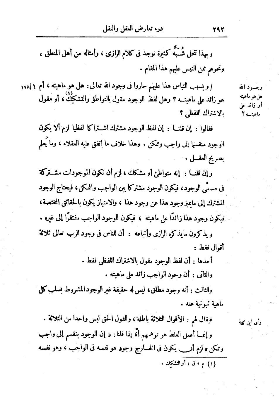ويذكرون ما يذكره الرازي وأتباعه: أن للناس في وجود الرب تعالى ثلاثة أقوال فقط: أحدها أن لفظ الوجود مقول بالاشتراك اللفظي فقط.