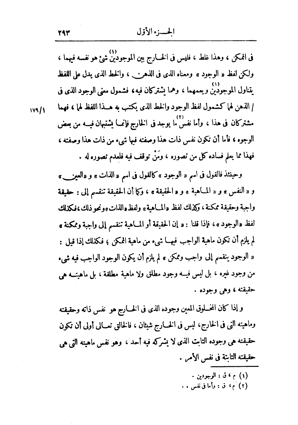 في الممكن، وهذا غلط، فليس في الخارج بين الموجودين شيء هو نفسه فيهما، ولكن لفظالوجود ومعناه الذي في الذهن، والخط الذي يدل على اللفظ يتناول الموجودين ويعمهما، وهما يشتركان فيه، فشمول معنى الوجود الذي في الذهن لهما كشمول لفظ الوجود والخط الذي يكتب به هذا اللفظ لهما، فهما مشتركان في هذا، وأما نفس ما يوجد في الخارج فإنما يشتبهان فيه من بعض الوجوه، فأما أن تكون نفس ذات هذا وصفته فيها شيء من ذات هذا وصفته، فهذا مما يعلم فساده كل من تصوره، ومن توقف فيه فلعدم تصوره له.