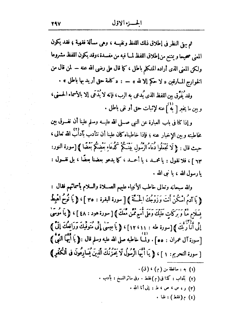 ثم يبقى النظر في إطلاق ذلك اللفظ ونفيه، وهي مسألة فقهية، فقد يكون المعنى صحيحاً ويمتنع من إطلاق اللفظ لما فيه من مفسدة، وقد يكون اللفظ مشروعاً ولكن المعنى الذي أراده المتكلم باطل، كما قال علي رضي الله عنه ـ لمن قال من الخوارج المارقين لا حكم إلا لله ـ: كلمة حق أريد بها باطل.