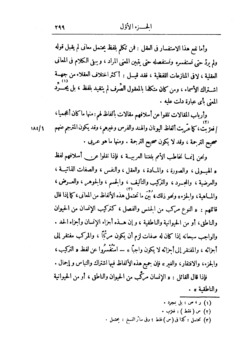 ونحن إنما نخاطب المم بلغتنا العربية، فإذا نقلوا عن أسلافهم لفظ الهيولى، والصورة، والمادة، والعقل، والنفس، والصفات الذاتية، والعرضية، والمجرد، والتركيب والتأليف، والجسم، والجوهر، والعرض، والماهية، والجزءونحو ذلك، بين ما تحتمل هذه الألفاظ من المعاني، كما إذا قال قائلهم: النوع مركب من الجنس والفصل، كتركيب الإنسان من الحيوان والناطق، أو من الحيوانية والناطقية، وإن هذه أجزاء الإنسان وأجزاء الحد، والواجب سبحانه إذا كان له صفات لزم أن يكون مركباً، ولمركب مفتقر إلى أجزائه، والمفتقر إلى أجزائه لا يكون واجباً ـ استفسروا عن لفظ التركيب، والجزء، والافتقار، والغير فإن جميع هذه الألفاظ فيها اشتراك والتباس وإجمال.