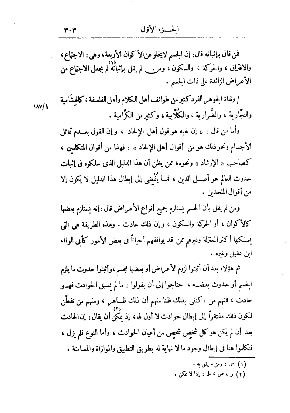 ومن لم يقل بأن الجسم يستلزم جميع أنواع الأعراض قال: إنه يستلزم بعضها كالأكوان، أو الحركة والسكون، وإن ذلك حادث.