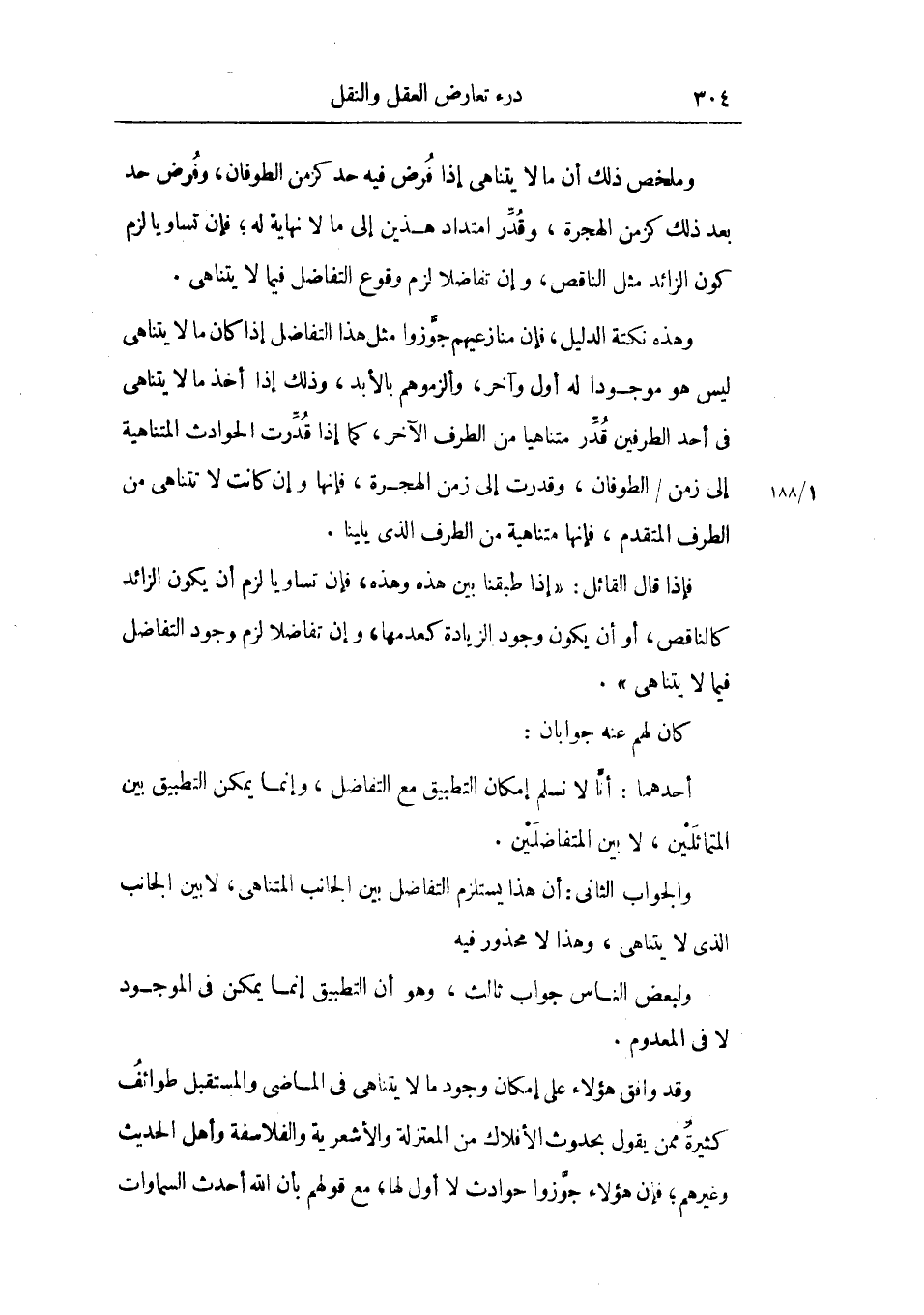 وملخص ذلك أن ما لا يتناهى إذا فرض فيه حد كزمن الطوفان، وفرض حد بعد ذلك كزمن الهجرة، وقدر امتداد هذين إلى ما لا نهاية له، فإن لزم كون الزائد مثل الناقص، وإن تفاضلا لزم وقوع التفاضل فيما لا يتناهى.
