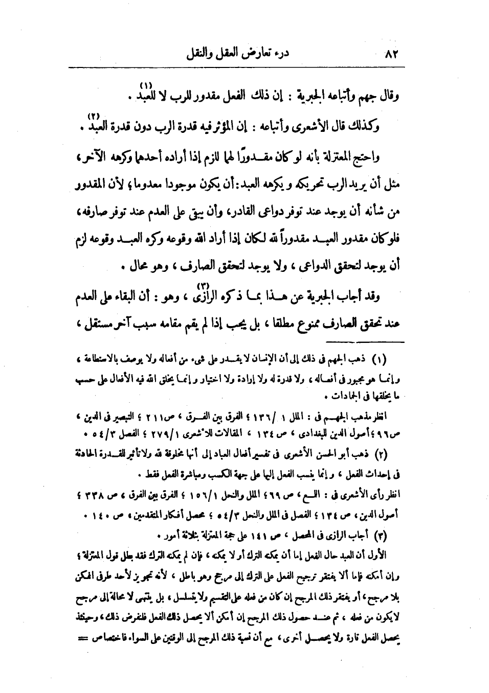 وقد أجاب الجبرية عن هذا بما ذكره الرازي، وهو: أن البقاء علي العدم عند تحقق الصارف ممنوع مطلقاً، بل يجب إذا لم يقم مقامه سبب آخر مستقل،
