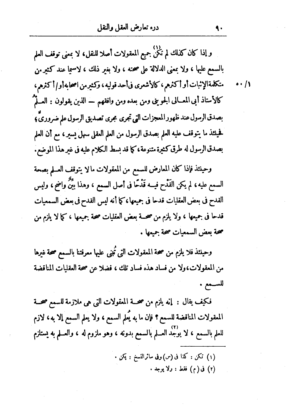 وإذا كان كذلك لم تكن جميع المعقولات أصلاً للنقل، لا بمعني توقف العلم بالسمع عليها، ولا بمعني الدلالة علي صحته، ولا بغير ذلك، لاسيما عند كثير من متكلمة الإثبات أو أكثرهم، كالأشعري في أحد قوليه، وكثير من أصحابه أو أكثرهم، كالأستاذأبي المعالي الجويني، ومن بعده من وافقهم ـ الذين يقولون: العلم بصدق الرسول عند ظهور المعجزات التي تجري مجري تصديق الرسول علم ضروري، فحينئذ ما يتوقف عليه العلم بصدق الرسول من العلم العقلي سهل يسير، مع أن العلم بصدق الرسول له طرق كثيرة متنوعة، كما قد بسط الكلام عليه في غير هذا الموضوع.