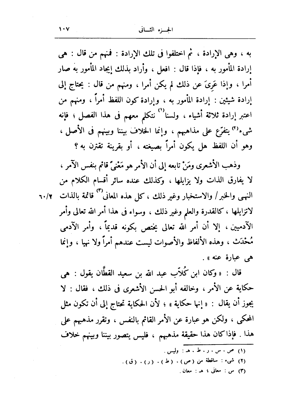 قال: (وكان ابن كلاب عبد الله بن سعيد القطان يقول: هي حكاية عن الأمر، وخالفه أبو الحسن الأشعري في ذلك، فقال: لا يجوز أن يقال: (إنها حكاية) ، لأن الحكاية تحتاج إلى أن تكون مثل المحكي، ولكن هو عبارة عن الأمر القائم بالنفس، وتقرر مذهبهم على هذا.