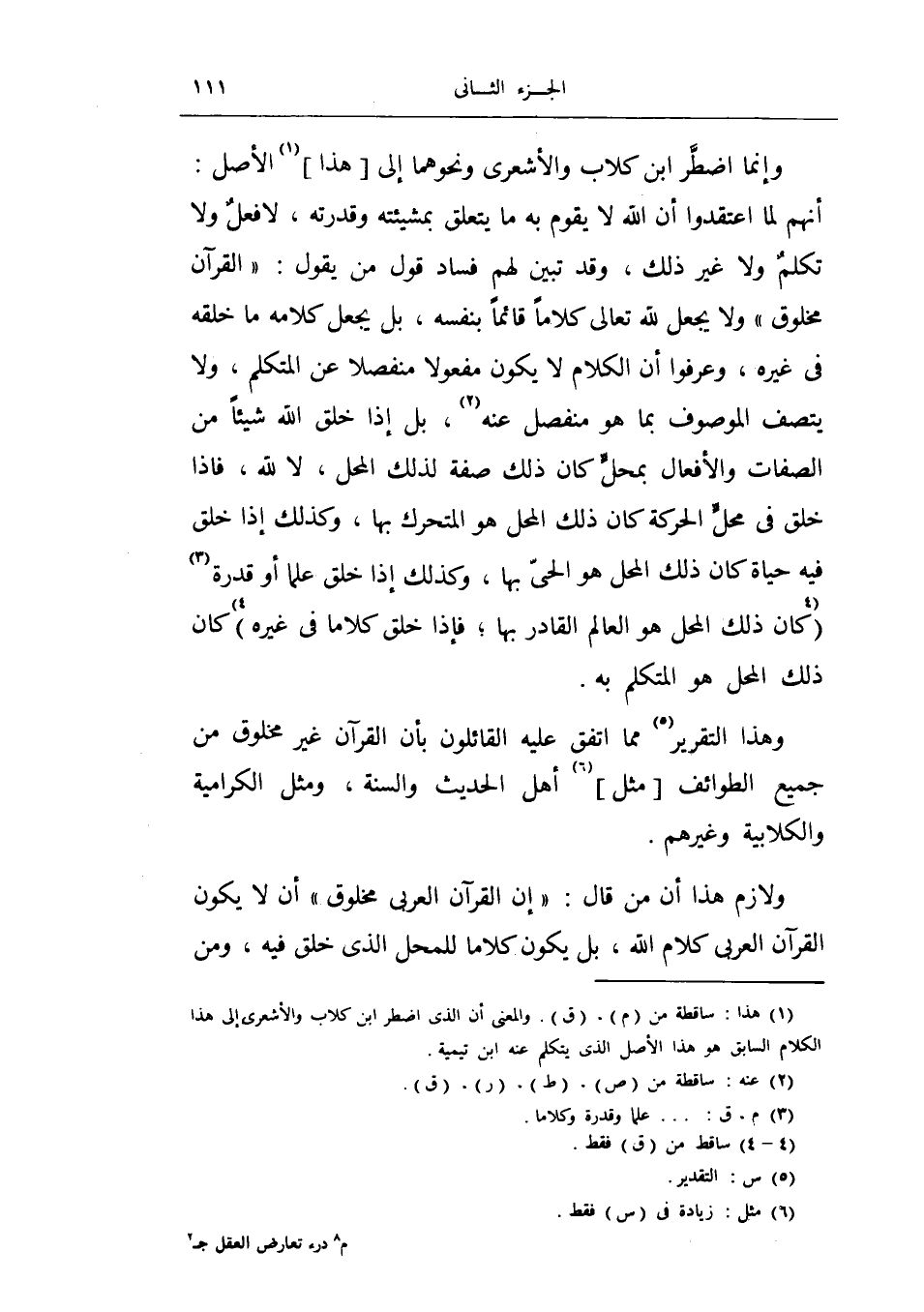 وإنما اضطر ابن كلاب والأشعري ونحوهما إلى هذا الأصل: أنهم لما اعتقدوا أن الله لا يقوم به ما يتعلق بمشيئته وقدرته، لا فعل ولا تكلم ولا غير ذلك، وقد تبين لهم فساد قول من يقول: (القرآن مخلوق) ولا يجعل لله تعالى كلاماً قائماً بنفسه، بل يجعل كلامه ما خلقه في غيره، وعرفوا أن الكلام لا يكون مفعولاً منفصلاً عن المتكلم، ولا يتصف الموصوف بما هو منفصل عنه، بل إذا خلق الله شيئاً من الصفات والأفعال بمحل كان ذلك صفة لذلك المحل، لا لله، فإذا خلق في محل الحركة كان ذلك المحل هو المتحرك بها، وكذلك إذا خلق فيه حياة كان ذلك المحل هي الحي بها، وكذلك إذا خلق علماً أو قدرة كان ذلك المحل هو العالم القادر بها، فإذا خلق كلاماً في غيره كان ذلك المحل هو المتكلم به.