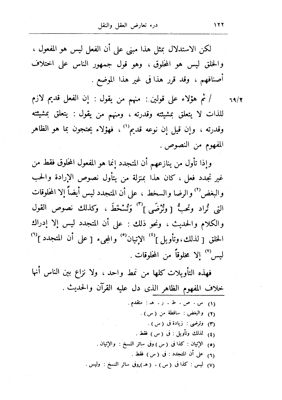 وإذا تأول من ينازعهم أن المتجدد إنما هو المفعول المخلوق فقط من غير تجدد فعل، كان هذا بمنزلة من يتأول نصوص الإرادة والحب والبغض والرضا والسخط، على أن المتجدد ليس أيضاً إلا المخلوقات التي تراد وتحب وترضى وتسخط، وكذلك نصوص القول والكلام والحديث، ونحو ذلك: على أن المتجدد ليس إلا إدراك الخلق لذلك، وتأويل الإتيان والمجيء على أن المتجدد ليس إلا مخلوقاً من المخلوقات.