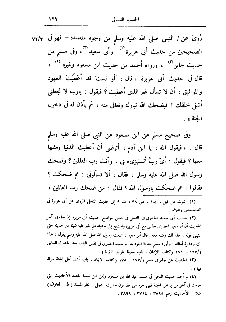 روي عن النبي صلى الله عليه وسلم من وجوه متعددة - فهو في الصحيحين من حديث أبي هريرة وأبي سعيد، وفي مسلم من حديث جابر، ورواه أحمد من حديث ابن مسعود وغيره، قال في حديث أبي هريرة «قال: أو لست قد أعطيت العهود والمواثيق: أن لا تسأل غير الذي أعطيت؟ فيقول: يا رب لا تجعلني أشقى خلقك! فيضحك الله تبارك وتعالى منه، ثم يأذن له في دخول الجنة» .