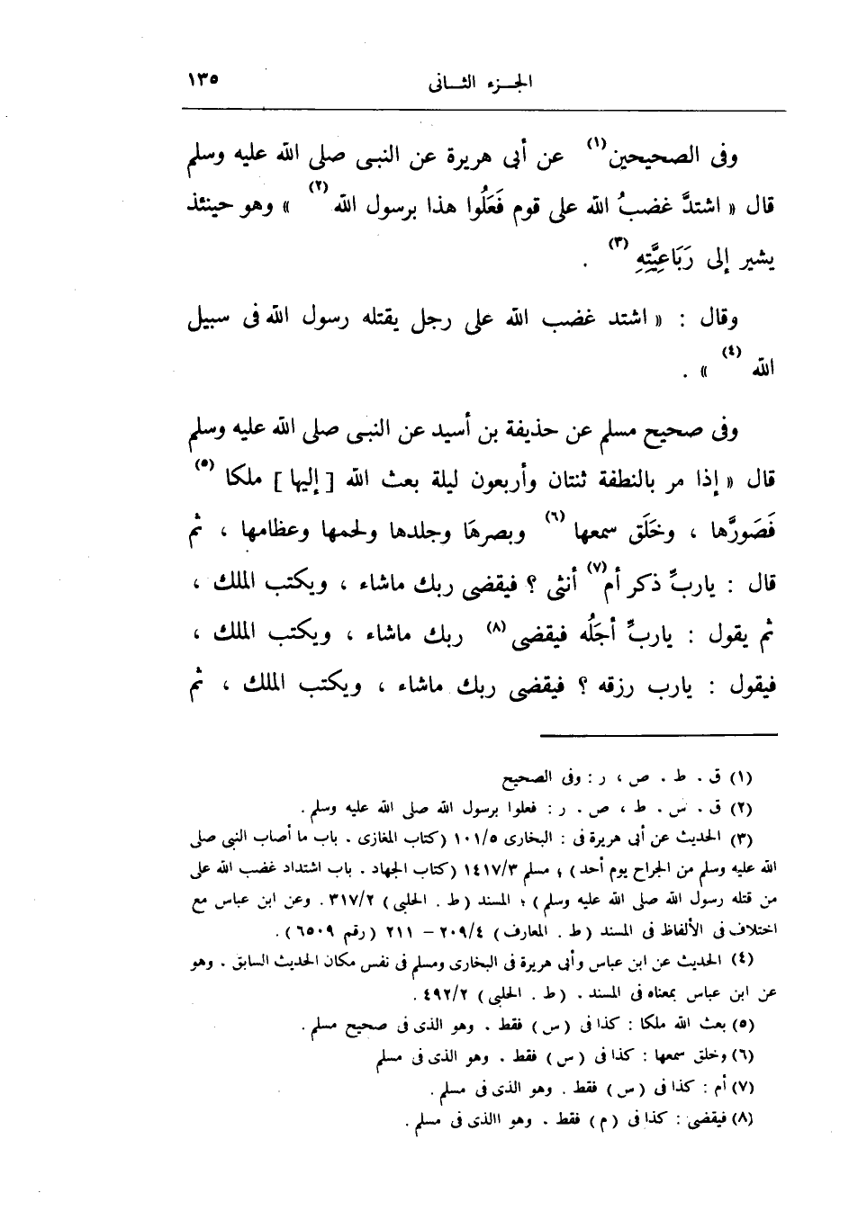 وفي صحيح مسلم عن حذيفة بن أسيد عن النبي صلى الله عليه وسلم قال «إذا مر بالنطفة اثنتان وأربعون ليلة بعث الله إليها ملكاً فصورها، وخلق سمعها وبصرها وجلدها ولحمها وعظامها، ثم قال: يا رب ذكر أم أنثى؟ فيقضي ربك ما شاء، ويكتب الملك، ثم يقول: يا رب أجله فيقضي ربك ما شاء، ويكتب الملك، فيقول: يا رب رزقه؟ فيقضي ربك ما شاء، ويكتب الملك، ثم