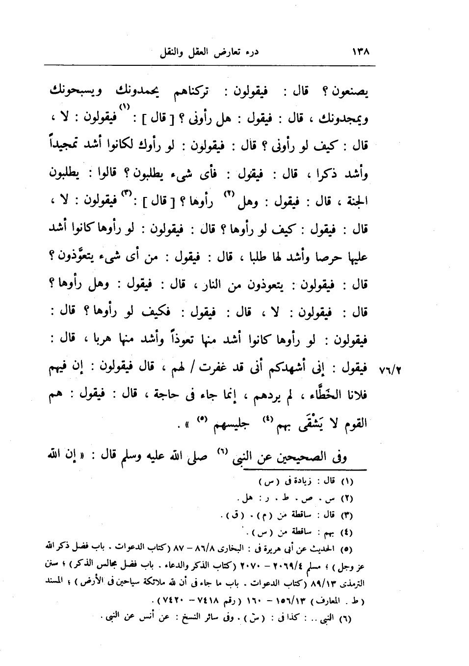 يصنعون؟ قال: فيقولون: تركناهم يحمدونك ويسبحونك ويمجدونك، قال: فيقول: هل رأوني؟ قال: فيقولون: لا، قال: كيف لو رأوني؟ قال: فيقولون: لو رأوك لكانوا أشد تمجيداً وأشد ذكراً، قال: فيقول: فأي شيء يطلبون؟ قالوا يطلبون الجنة، قال: فيقول: وهل رأوها؟ قال: فيقولون: لا، قال: فيقول: كيف لو رأوها؟ قال: فيقولون: لو رأوها كانوا أشد عليها حرصاً وأشد لها طلباً، قال: فيقول: من أي شيء يتعوذون؟ قال: فيقولون: يتعوذون من النار، قال: فيقول: وهل رأوها؟ قال: فيقولون: لا، قال: فيقول: كيف لو رأوها؟ قال: فيقولون: لو رأوها كانوا أشد منها تعوذاً وأشد منها هرباً، قال: فيقول: إني أشهدكم أني قد غفرت لهم، قال فيقولون: إن فيهم فلانا الخطاء، لم يردهم، إنما جاء في حاجة، قال: فيقول: هم القوم لا يشقى بهم جليسهم» .